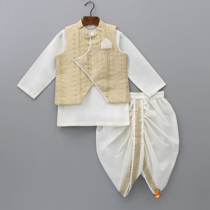 Elegant Boy Dhoti Kurta Set with Embroidered Jacket – Cream & Golden